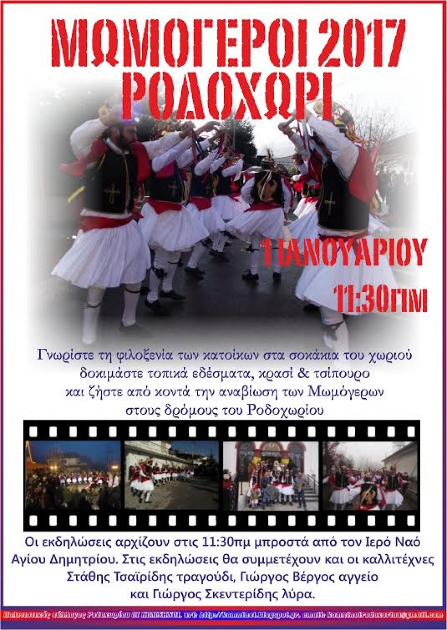 Ο Πολιτιστικός σύλλογος Ροδοχωρίου ΟΙ ΚΟΜΝΗΝΟΙ σας προσκαλεί να ζήσετε από κοντά, την αναβίωση του πανάρχαιου δρώμενου Μωμόγεροι, την Κυριακή 1 Ιανουαρίου (ανήμερα της Πρωτοχρονιάς) στο Ροδοχώρι.