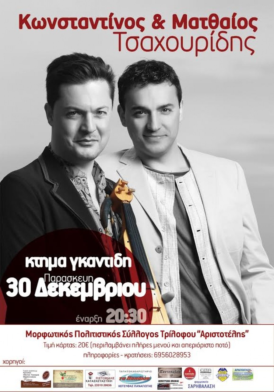 Ο Μορφωτικός Πολιτιστικός Σύλλογος Τριλόφου «Αριστοτέλης» σας προσκαλεί σε μια εορταστική βραδιά! Ελάτε να γιορτάσουμε το κλείσιμο της νέας χρονιάς με τους αδελφούς Κωνσταντίνο & Ματθαίο Τσαχουρίδη, που με δοξάρι και φωνή έρχονται να παίξουν και να τραγουδήσουν ό,τι καινούριο και ό,τι παλιό τους αγγίζει…