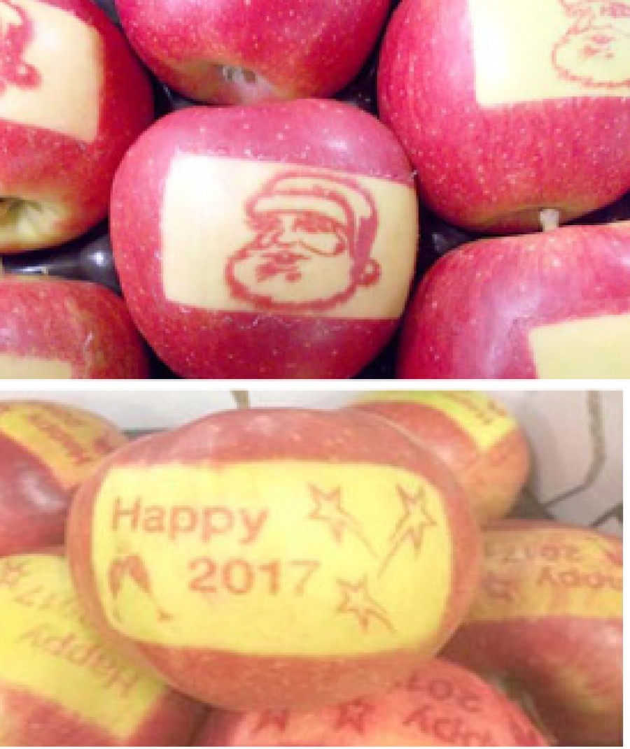 Τοποθετούνται αυτοκόλλητα με τη μορφή του Αγίου Βασιλείου ή με ευχές των εορτών Χριστουγέννων-Πρωτοχρονιάς, σε διάφορες γλώσσες ανάλογα με τη χώρα όπου προορίζεται να εξαχθούν. Με τη φυσιολογική διαδικασία απόκτησης του χρώματος του καρπού εμφανίζονται εντυπωσιακά αποτελέσματα, όπως φαίνεται στις εικόνες παρακάτω.