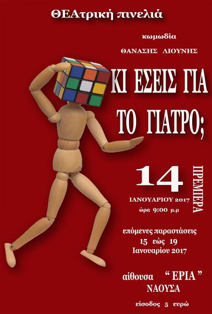Τα μέλη της «ΘΕΑτρικής πινελιάς» βρίσκονται σε εντατικό ρυθμό προβών, προκειμένου να ανέβει στη σκηνή η νέα τους θεατρική δράση. Πρόκειται για το έργο του Θανάση Λιούνη «Κι εσείς για το γιατρό;». Μια σύγχρονη κωμωδία, γεμάτη αστείες και ευρηματικές ατάκες που υπόσχεται αβίαστο γέλιο και πλούσια συναισθήματα. Ο συγγραφέας, με «όπλο» το χιούμορ, καταφέρνει να θίξει διάφορες πτυχές της σημερινής μας κοινωνίας.