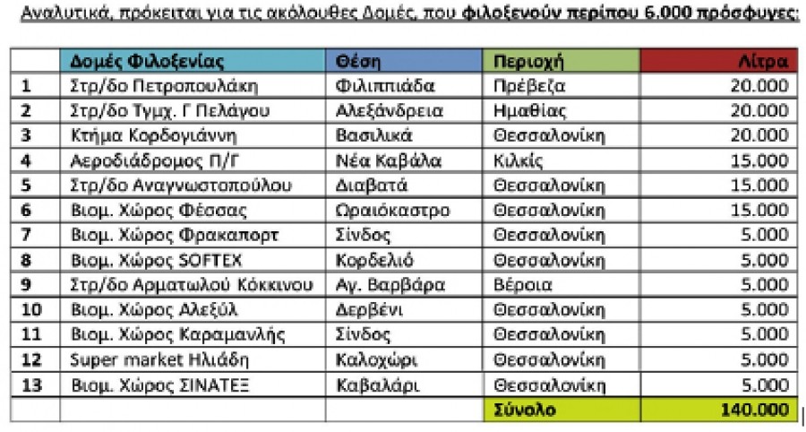 Πιο συγκεκριμένα στο κέντρο φιλοξενίας της Αλεξάνδρειας θα διατεθούν 20.000 λίτρα και στο κέντρο της Αγ. Βαρβάρας Βέροιας 5.000 τόνοι