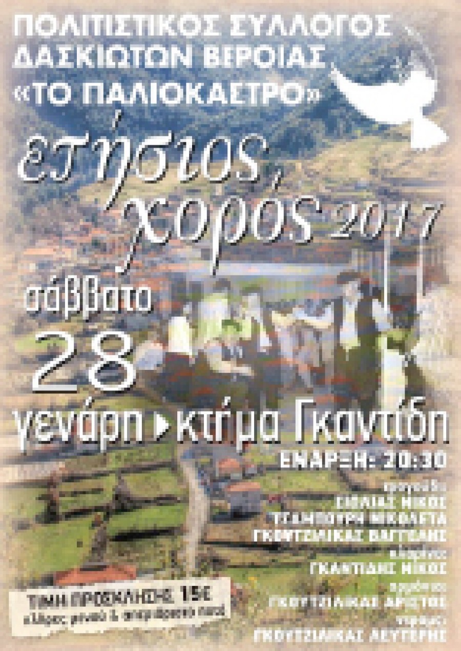 Ο Πολιτιστικός Σύλλογος Δασκιωτών Βεροίας «Το Παλιόκαστρο» διοργανώνει τον ετήσιο χορό του το Σάββατο 28 Ιανουαρίου 2017 στο «κτήμα Γκαντίδη», με μία όμορφη παραδοσιακή βραδιά με την ορχήστρα του Νίκου Γκαντίδη καθώς κ με την παραδοσιακή γκάιντα του Θανάση Γράτσιανου. Τιμή εισόδου 15ευρώ απεριόριστο ποτό.