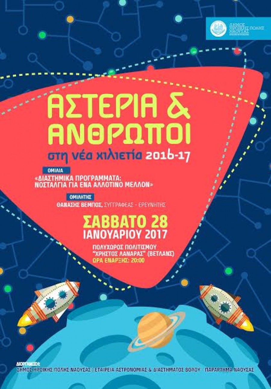 Το ερχόμενο Σάββατο στις 8μμ στην αίθουσα του Πολυχώρου Πολιτισμού ‘Χρήστος Λαναράς’ (αίθουσα Βέλτανς) θα πραγματοποιηθεί ομιλία στα πλαίσια της σειράς «Αστέρια και Άνθρωποι στη Νέα Χιλιετία», που διοργανώνει η Εταιρεία Αστρονομίας και Διαστήματος Βόλου/Παράρτημα Νάουσας. Θέμα: «ΔΙΑΣΤΗΜΙΚΑ ΠΡΟΓΡΑΜΜΑΤΑ: ΝΟΣΤΑΛΓΙΑ ΓΙΑ ΕΝΑ ΑΛΛΟΤΙΝΟ ΜΕΛΛΟΝ». Ομιλητής θα είναι ο συγγραφέας-ερευνητής Θανάσης Βέμπος.