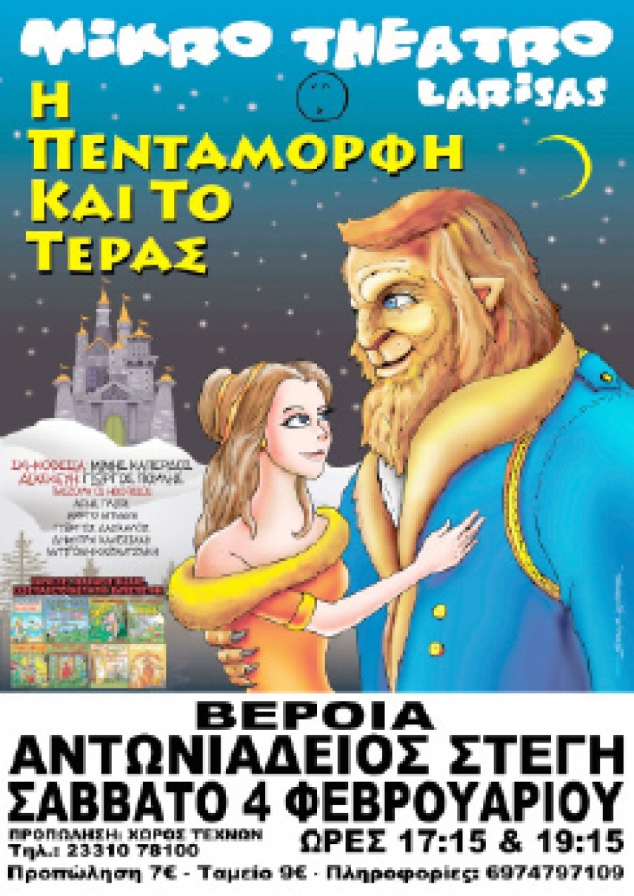 Η «Πεντάμορφη και το τέρας» από το Μικρό Θέατρο Λάρισας παρουσιάζεται στην Αντωνιάδειο Στέγη της Βέροιας, το Σάββατο 4 Φεβρουαρίου, σε δύο παραστάσεις, 5.15 και 7.15 το απόγευμα.