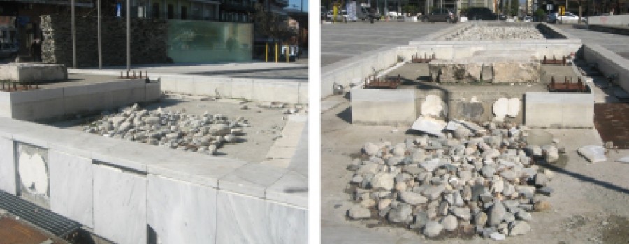 Η μεγάλη γούρνα – σιντριβάνι, είναι εδώ και χρόνια γεμάτη γκρίζες κοτρόνες και δίπλα της η υποτιθέμενη μαρμάρινη βάση για το υπό εγκατάσταση (κάποτε) ρολόι, μια ρημαγμένη κατασκευή.