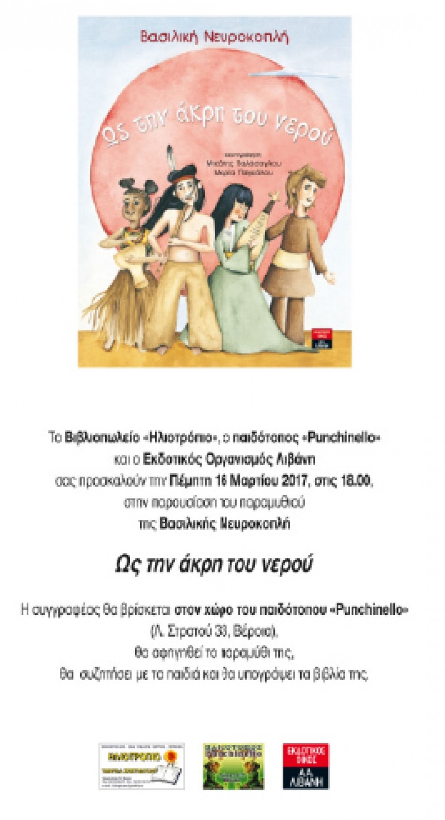 Το Βιβλιοπωλείο «Ηλιοτρόπιο», ο παιδότοπος «Punchinello» και ο Εκδοτικός Οργανισµός Λιβάνη παρουσιάζουν την Πέµπτη 16 Μαρτίου, στις 6:00 μ.μ. το παραμύθι της Βασιλικής Νευροκοπλή «Ως την άκρη του νερού».