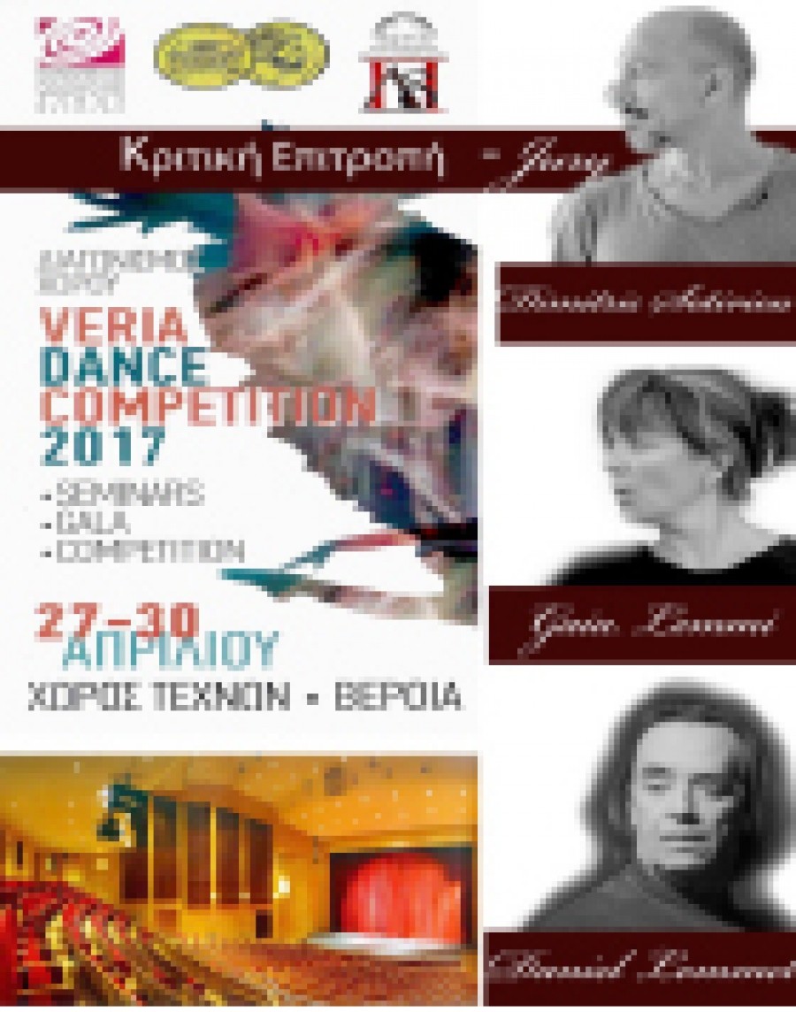 Στις 28 εώς 30 Απριλίου θα πραγματοποιηθεί στο Χώρο Τεχνών Βεροίας στο πλαίσιο της διοργάνωσης «Veria Dance 2017» o Διαγωνισμός Χορού «Veria Dance Competition 2017». Οι συμμετέχοντες θα διαγωνιστούν στον κλασσικό, σύγχρονο, καρακτέρ και νεοκλασσικό χορό. Η τριμελής κριτική επιτροπή, αποτελείται από τους διακεκριμένους στο χώρο του χορού : Daniel Lommel, Gaia Lemmi και Δημήτρη Σωτηρίου.