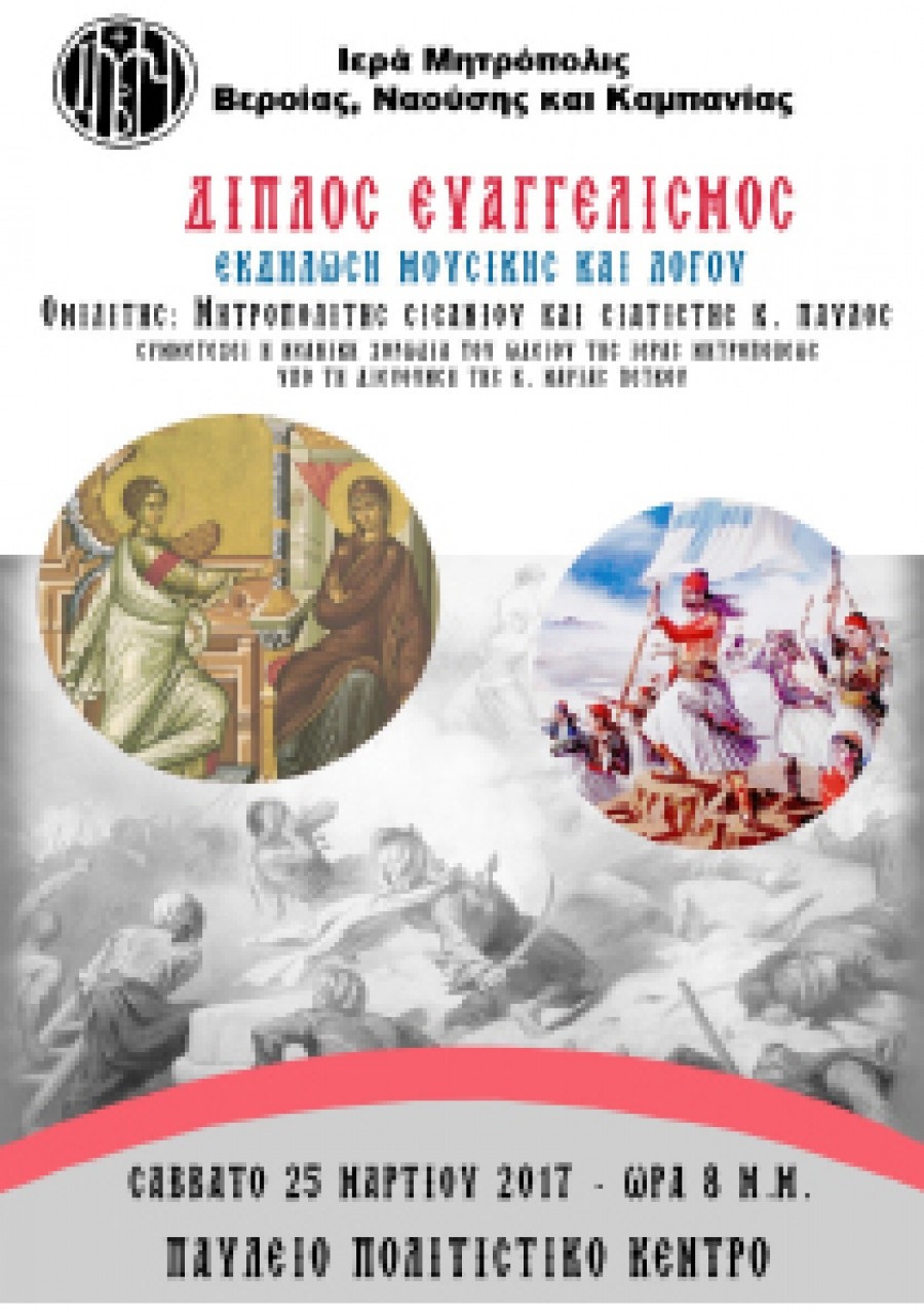 Εκδήλωση μουσικής και λόγου διοργανώνει η Ι. Μητρόπολη το Σάββατο 25 Μαρτίου με ομιλητή τον Μητροπολίτη Σισανίου και Σιατίστης κ. Παύλο. Θα συμμετέχει η νεανική χορωδία του Ωδείου της Ιεράς Μητροπόλεως υπό τη διεύθυνση της κ. Μαρίας Πέτκου. Η εκδήλωση θα γίνει στο Παύλειο Πολιτιστικό Κέντρο Βέροιας στις 8.00μ.μ.