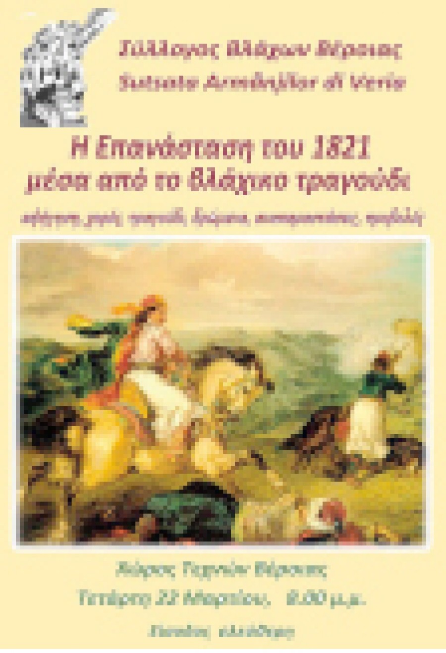 O Σύλλογος Βλάχων Βέροιας, με την υποστήριξη της ΚΕΠΑ Δήμου Βέροιας, οργανώνει εκδήλωση με θέμα: « Η επανάσταση του 1821 μέσα από το βλάχικο τραγούδι» , στο Χώρο Τεχνών, την Τετάρτη 22 Μαρτίου, 8.00 μ.μ. Η παράσταση περιλαμβάνει αφήγηση, χορό , τραγούδι, δρώμενα, αναπαραστάσεις και προβολές.