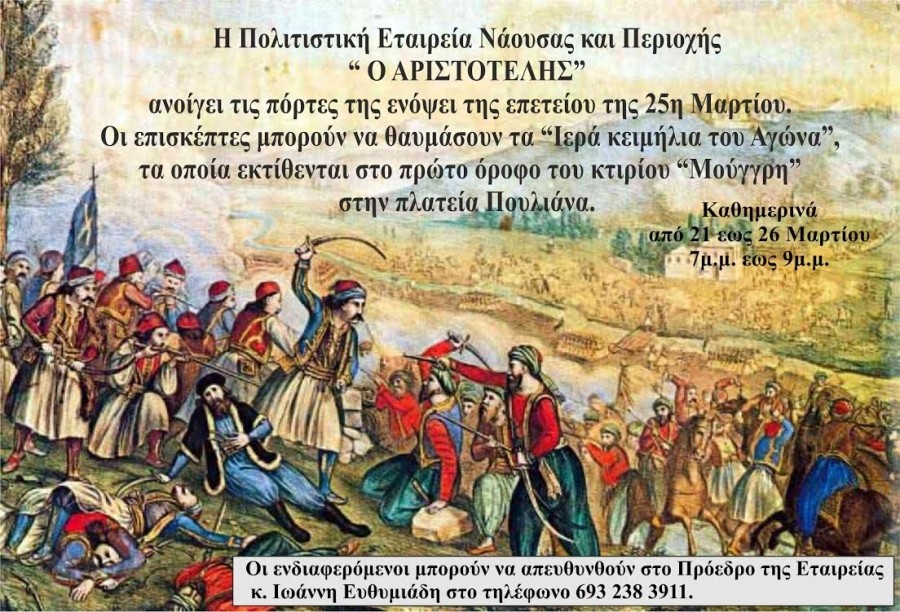 Τις πόρτες του κτιρίου ΄Χριστόδουλος Λαναράς΄ ανοίγει η Πολιτιστική Εταιρεία Νάουσας και Περιοχής “Ο Αριστοτέλης”, ενόψει της επετείου της 25ης Μαρτίου. Οι επισκέπτες μπορούν να θαυμάσουν τα “Ιερά κειμήλια του Αγώνα”, τα οποία εκτίθενται στον πρώτο όροφο του κτιρίου, στην πλατεία Πουλιάνας, καθημερινά από 21 ως 26 Μαρτίου 7-9μμ.