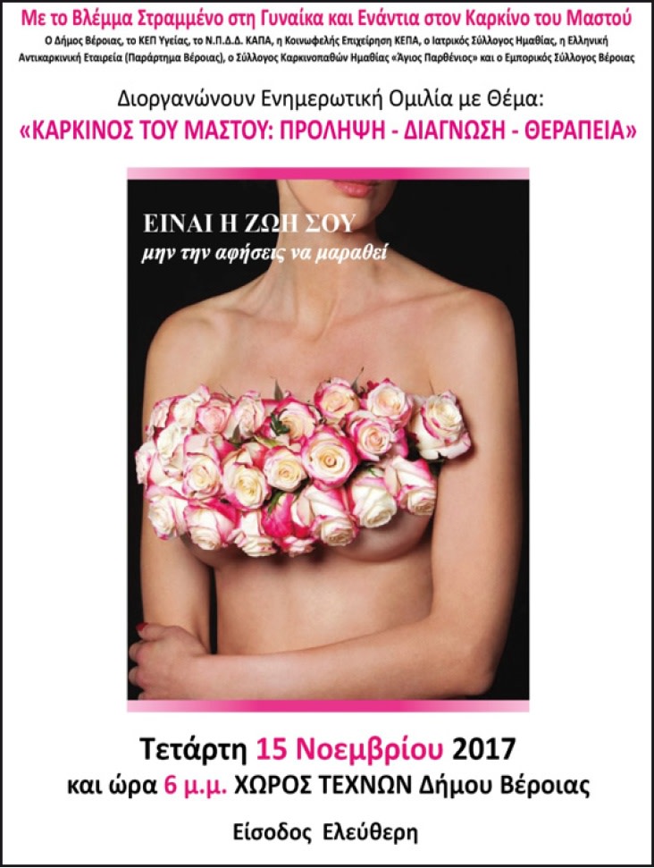 Ενημερωτική εκδήλωση για τον καρκίνο του μαστού, την πρόληψη, διάγνωση και θεραπεία του, πραγματοποιείται αύριο Τετάρτη στο Χώρο Τεχνών Βέροιας, από τον Δήμο και Κοινωνικούς και Επιστημονικούς φορείς.
