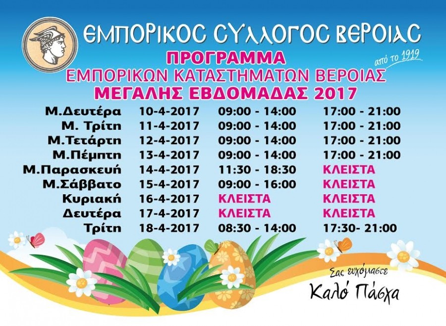 Το πρόγραμμα της αγοράς για τη Μεγάλη Εβδομάδα και το καλοκαιρινό ωράριο έδωσε στη δημοσιότητα ο Εμπορικός Σύλλογος Βέροιας.