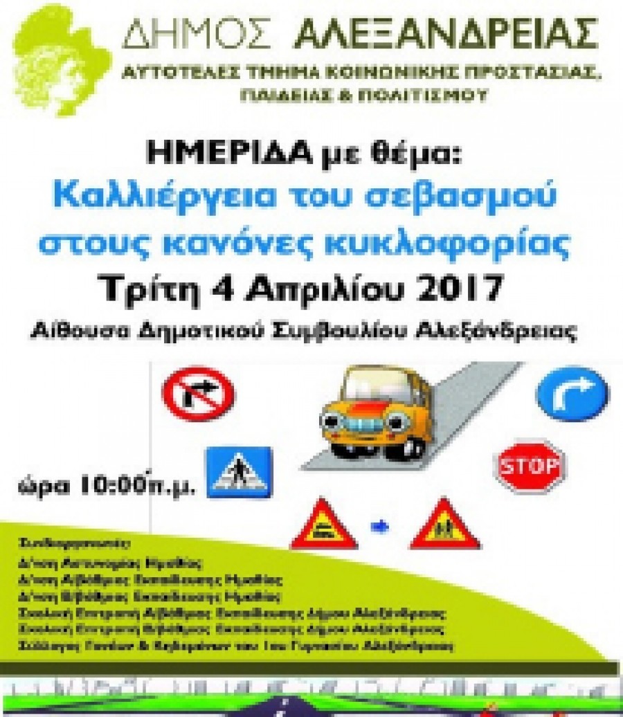 Το Αυτοτελές Τμήμα Κοινωνικής Προστασίας Παιδείας και Πολιτισμού του Δήμου Αλεξάνδρειας πραγματοποιεί: την Τρίτη 4 Απριλίου 2017 στις 10:00π.μ. στην αίθουσα συνεδριάσεων του Δημοτικού Συμβουλίου Αλεξάνδρειας (Δημαρχείο Αλεξάνδρειας, Εθνικής Αντίστασης 42), ημερίδα με θέμα ¨Καλλιέργεια του σεβασμού στους κανόνες κυκλοφορίας¨.
