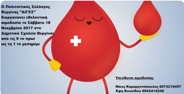 Η εθελοντική αιμοδοσία θα πραγματοποιηθεί το Σάββατο 18 Νοεμβρίου 2017 στο Δημοτικό Σχολείο Βεργίνας από τις 9 το πρωί ως τη 1 το μεσημέρι. Υπεύθυνοι αιμοδοσίας: Νίκος Καραμητσόπουλος 6973216457 Έφη Κουσίδου 6942414246.