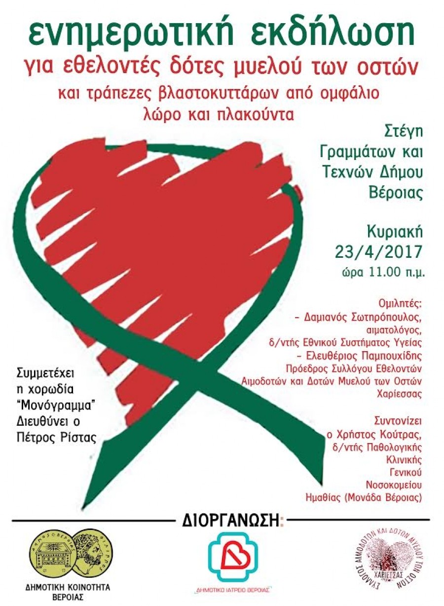 Ενημερωτική εκδήλωση για εθελοντές δότες μυελού των οστών και τράπεζες βλαστοκυττάρων από ομφάλιο λώρο και πλακούντα θα πραγματοποιηθεί την Κυριακή 23 Απριλίου στις 11πμ στην Αντωνιάδειο Στέγη του δήμου Βέροιας. Ομιλητές είναι οι κ.κ. Δαμιανός Σωτηρόπουλος, αιματολόγος και διευθυντής ΕΣΥ και Λευτέρης Παμπουχίδης, πρόεδρος Συλλόγου Εθελοντών Αιμοδοτών και Δοτών Μυελού των Οστών. Συντονίζει ο Χρήστος Κούτρας, διευθυντής της Παθολογικής Κλινικής του Νοσοκομείου Βέροιας.