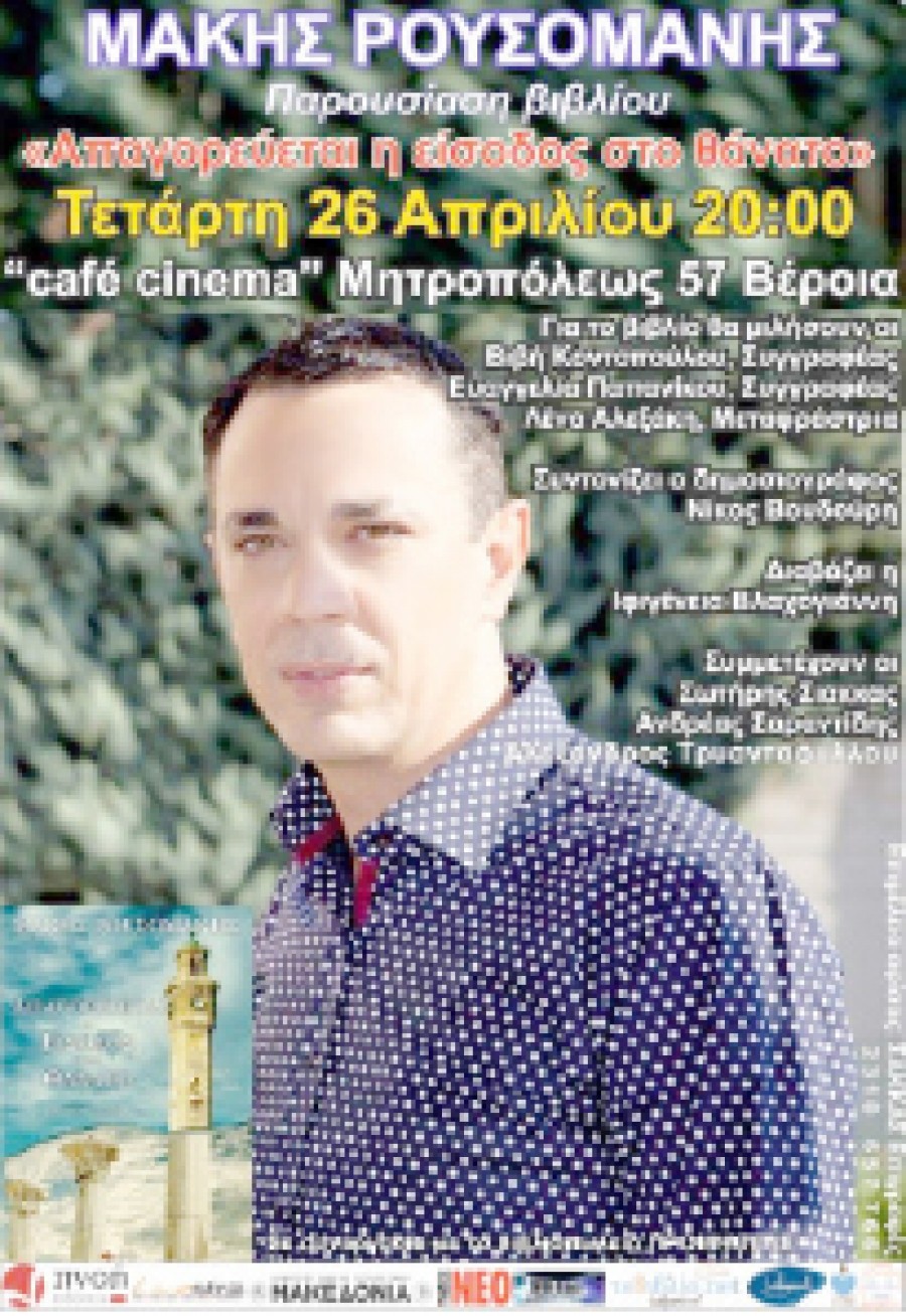 Οι Εκδόσεις «Πνοή» σε συνεργασία με το βιβλιοπωλείο «Προμηθέας», παρουσιάζουν την ΤΕΤΑΡΤΗ 26 Απριλίου στις 8 το βραδυ, το νέο μυθιστόρημα του Μάκη Ρουσομάνη με τίτλο «Απαγορεύεται η είσοδος στον θάνατο», στο «cafe cinema» (Μητροπόλεως 57 – ΒΕΡΟΙΑ , Πληροφορίες: 2331 0 22373).