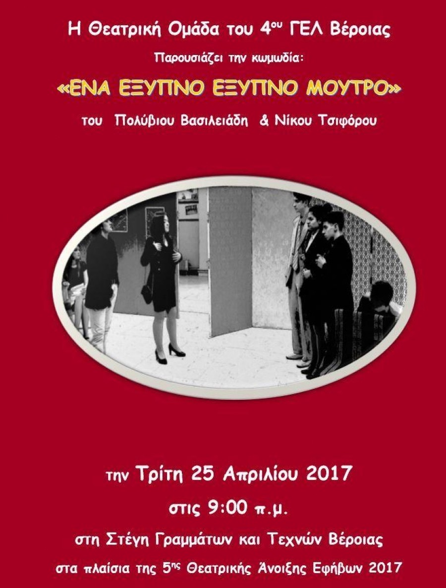 Στον θεατρικό διαγωνισμό της 5ης Θεατρικής Άνοιξης Εφήβων συμμετέχει φέτος η θεατρική ομάδα του 4ου ΓΕΛ Βέροιας, παίζοντας την Τρίτη 25 Απριλίου στις 9 το πρωί στην Αντωνιάδειο Στέγη το έργο των Πολύβιου Βασιλειάδη – Νίκου Τσιφόρου “Ένα έξυπνο έξυπνο μούτρο”.