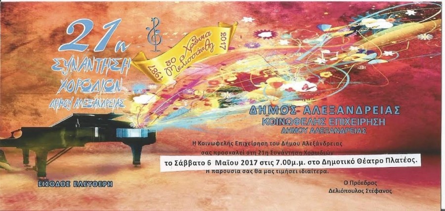 Το Σάββατο 6 Μάη στις 7 μμ θα πραγματοποιηθεί στο δημοτικό θέατρο Πλατέος η 21η Συνάντηση Χορωδιών του Δήμου Αλεξάνδρειας, με τη συμμετοχή των χορωδιών: