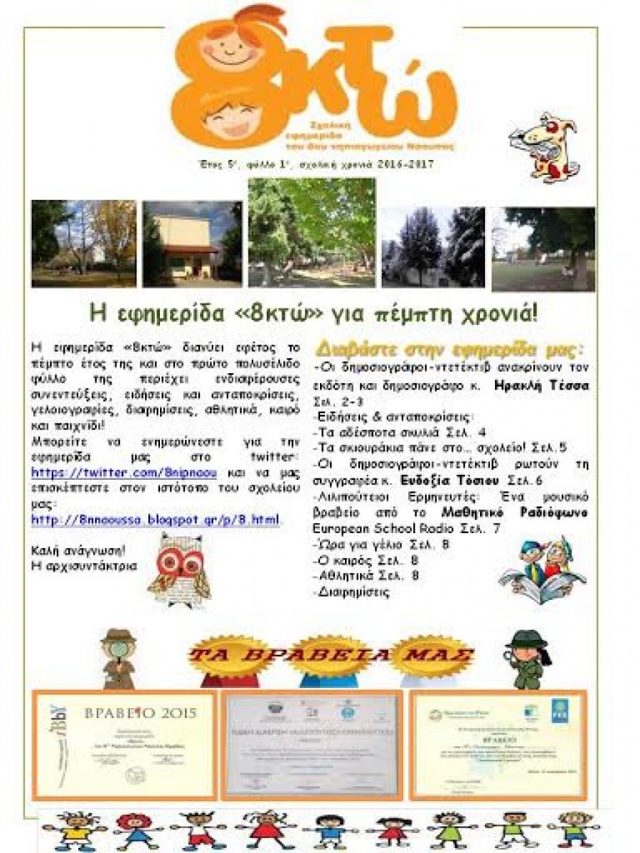 Το πέμπτο έτος συνεχούς κυκλοφορίας συμπληρώνει φέτος η εφημερίδα «8κτώ» του 8ου Νηπιαγωγείου Νάουσας. Στο φύλλο της οι λιλιπούτειοι δημοσιογράφοι παίρνουν συνέντευξη από τον εκδότη-δημοσιογράφο κ. Ηρακλή Τέσσα και  συνομιλούν με την συγγραφέα κ. Ευδοξία Τόσιου για το βιβλίο της «Η χώρα του μη». Γράφουν ειδήσεις για τα σκιουράκια του σχολείου τους αλλά και για τα αδέσποτα σκυλιά. Παρουσιάζουν το μουσικό βραβείο τους απ’ το Μαθητικό Ραδιόφωνο και φτιάχνουν διαφημίσεις, γελοιογραφίες και σκίτσα, ενώ δεν λείπουν ο καιρός και -κυρίως -τα αθλητικά με τον πολυαναμενόμενο αγώνα Παναθηναϊκός-Νάουσα!!!