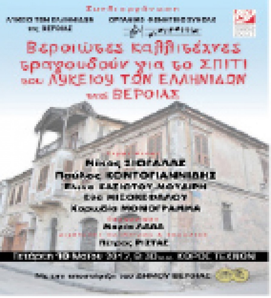 Το Οργανικό Φωνητικό Σύνολο «Μονόγραμμα» σε συνεργασία με το Λύκειο Ελληνίδων της Βέροιας, διοργανώνουν μουσικοχορευτική εκδήλωση με τίτλο «Βεροιώτες καλλιτέχνες τραγουδούν για το Σπίτι του Λυκείου των Ελληνίδων Βέροιας» με την υποστήριξη του Δήμου Βέροιας.