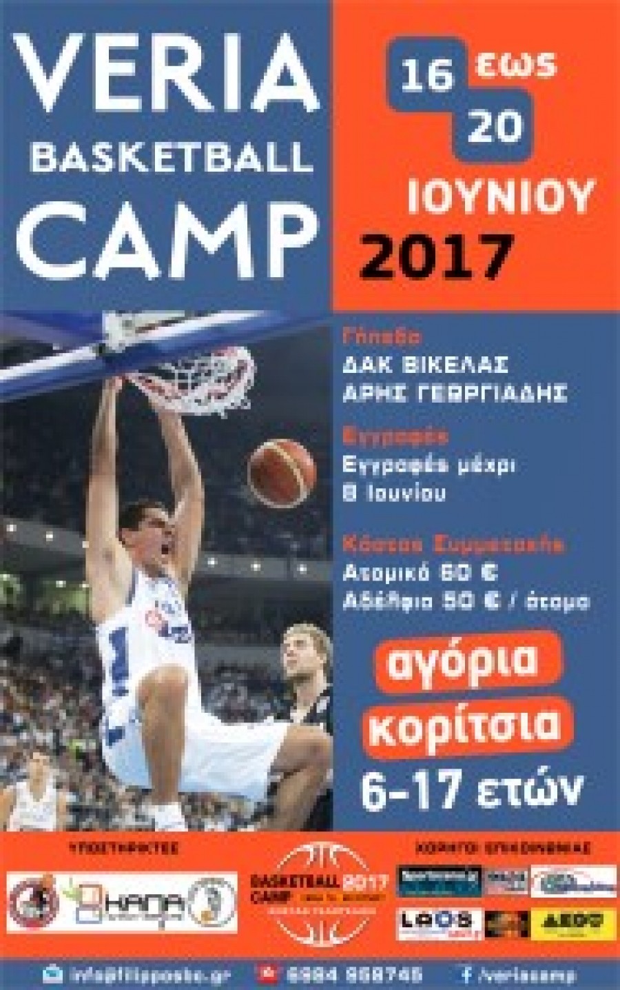 Το «Veria Basketball Camp 2017» θα διεξαχθεί στα γήπεδα μπάσκετ του Δ.Α.Κ «Δημήτριος Βικέλας» και «Άρης Γεωργιάδης» από τις 16/6 έως τις 20/6 και συμμετοχή μπορούν να δηλώσουν αγόρια και κορίτσια από 6-17 ετών.