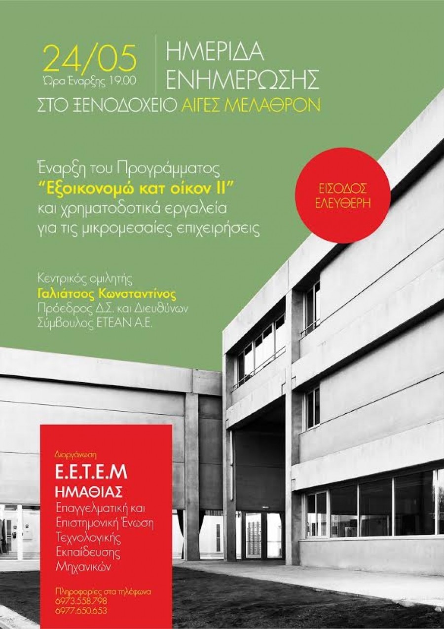 Ενημερωτική ημερίδα με θέμα: Έναρξη του Προγράμματος «Εξοικονομώ κατ΄ οίκον ΙΙ» και Χρηματοδοτικά Εργαλεία για τις Μικρομεσαίες Επιχειρήσεις διοργανώνει την Τετάρτη 24 Μαΐου στις 7μμ στο Ξενοδοχείο Αιγές Μέλαθρον η Επαγγελματική και Επιστημονική Ένωση Τεχνολογικής Εκπαίδευσης Μηχανικών (ΕΕΤΕΜ) Ημαθίας, εν αναμονή της ενάρξεως του σχετικού προγράμματος.