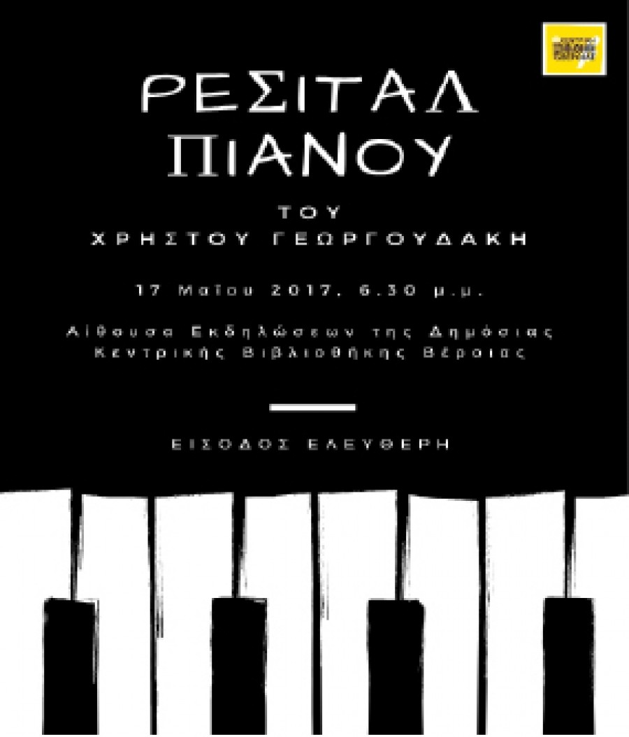 Ρεσιτάλ πιάνου του Χρήστου Γεωργουδάκη, τελειόφοιτου του τμήματος Μουσικής Επιστήμης & Τέχνης του Πανεπιστημίου Μακεδονίας, θα δοθεί σήμερα Τετάρτη 17 Μαΐου στις 6.30 το απόγευμα, στην αίθουσα εκδηλώσεων της Δημόσιας Βιβλιοθήκης Βέροιας.