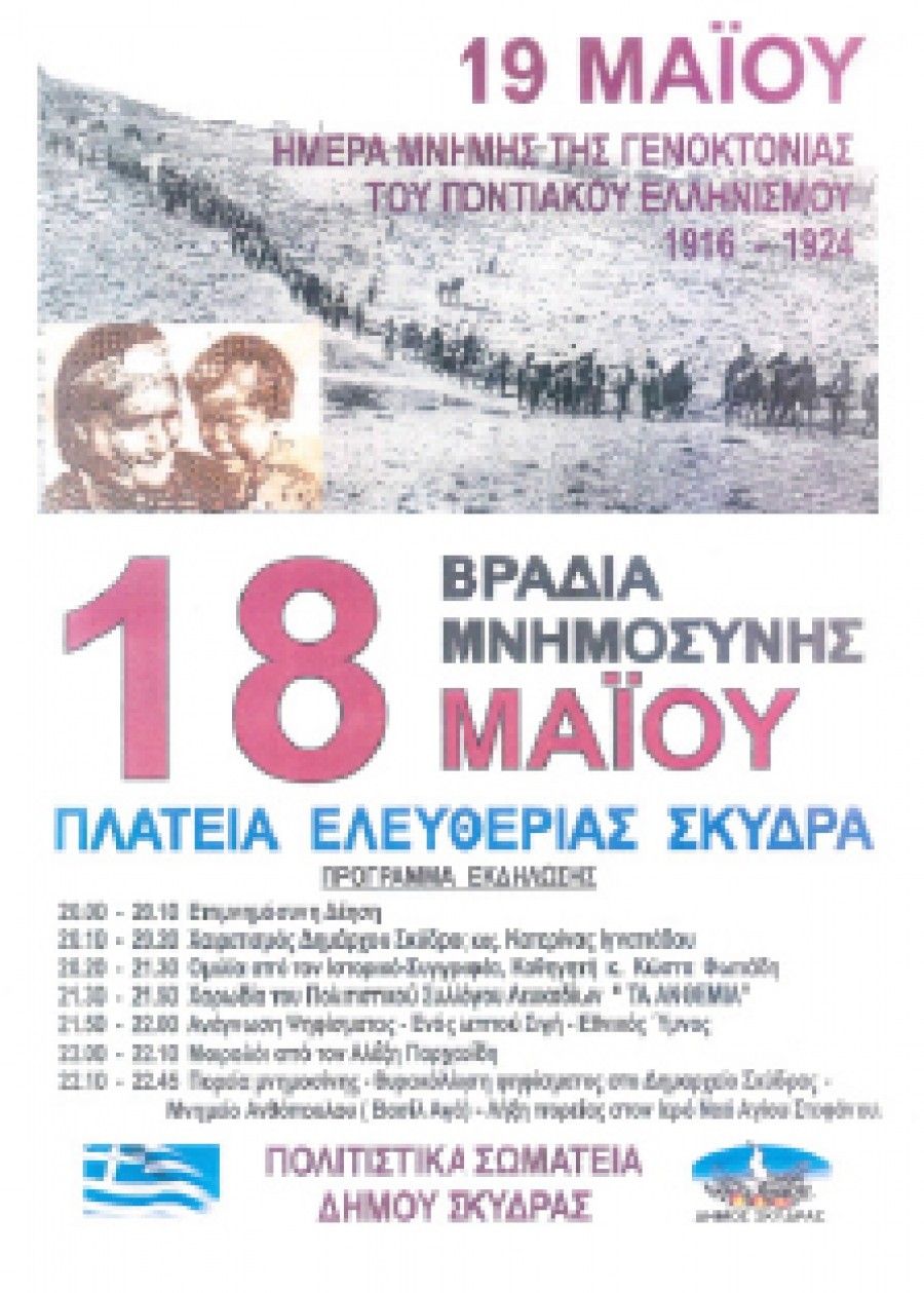 Οι Πολιτιστικοί Σύλλογοι του Δ. Σκύδρας διοργανώνουν στις 18 Μαΐου παραμονή της γενοκτονίας των Ελλήνων, Βραδιά μνημοσύνης, με ομιλητή τον ιστορικό συγγραφέα καθ. Κων/νο Φωτιάδη, τον Αλέξανδρο Παρχαρίδη στο μοιρολόι και την χορωδία του Πολιτιστικού Συλλόγου Λευκαδίων «Τα Ανθέμια».