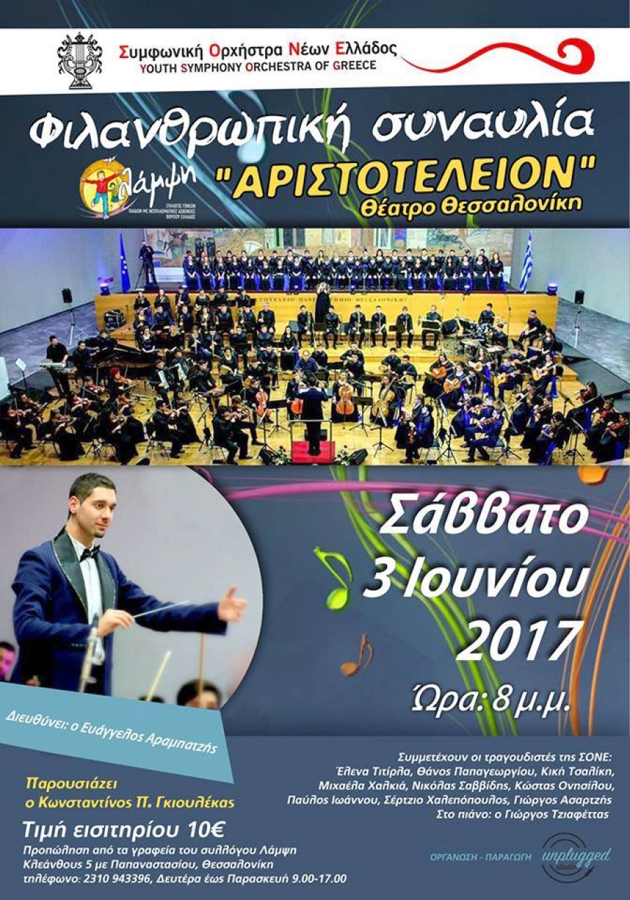 Η Συμφωνική Ορχήστρα Νέων Ελλάδος (ΣΟΝΕ) νέοι μουσικοί από όλη την Ελλάδα, ενώνουν τις δυνάμεις τους και διοργανώνουν φιλανθρωπική συναυλία, υπό την διεύθυνση του Ευάγγελου Αραμπατζή.