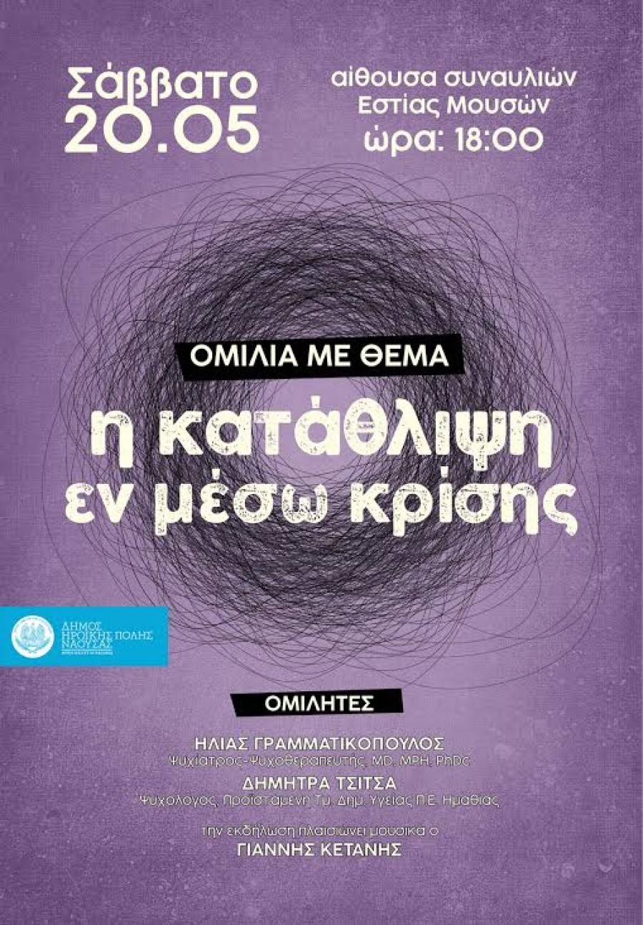 Ομιλία με θέμα ΄Η κατάθλιψη εν μέσω κρίσης΄ διοργανώνει το ερχόμενο Σάββατο στην αίθουσα συναυλιών της Εστίας Μουσών ο δήμος Νάουσας, στο πλαίσιο των ενημερωτικών εκδηλώσεων που έχει προγραμματίσει με την ένταξή του στο Εθνικό Διαδημοτικό Δίκτυο Υγειών Πόλεων.