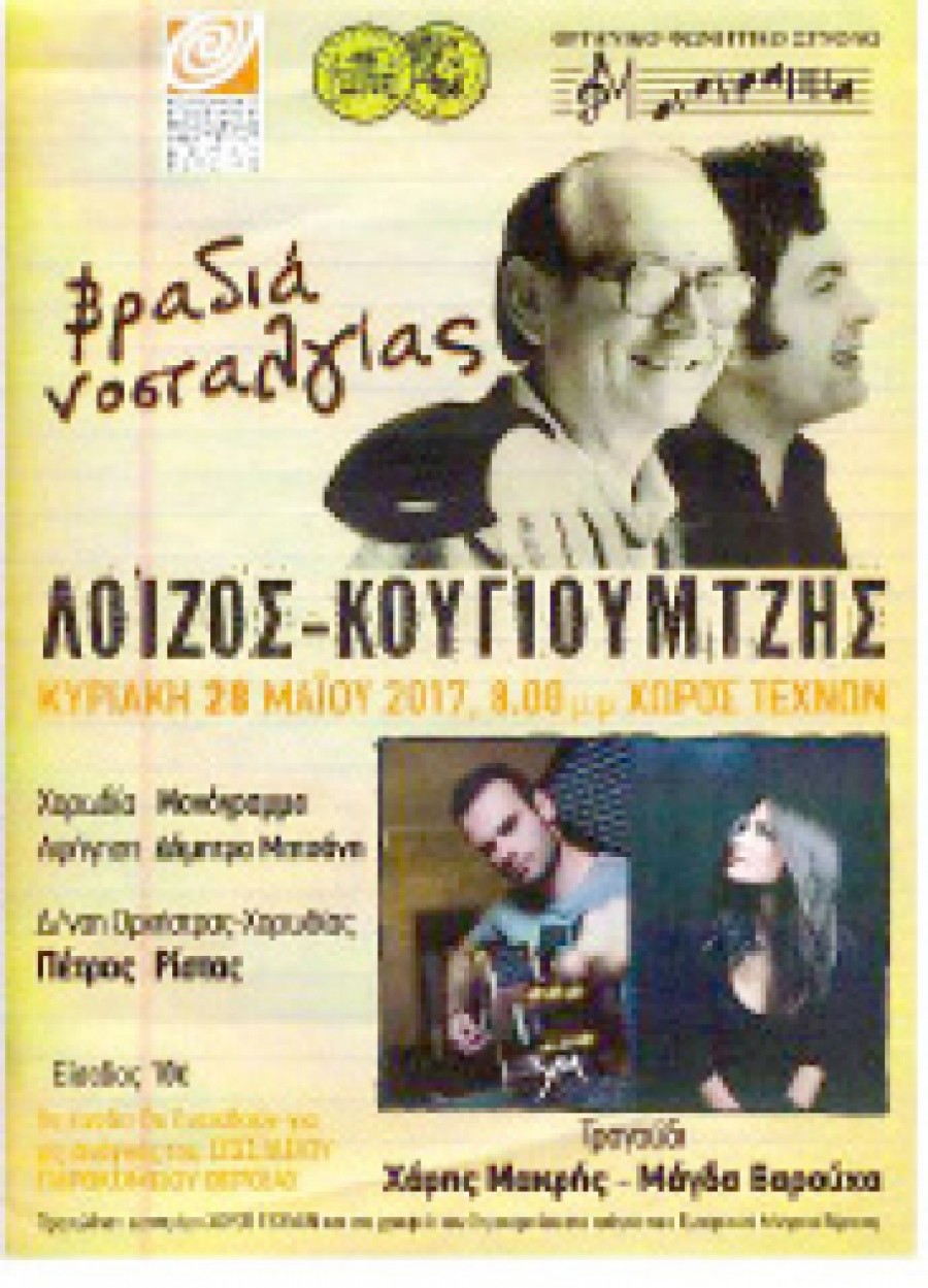 Το Δ.Σ. του Αδελφάτου του Γηροκομείου Βέροιας διοργανώνει μουσική βραδιά νοσταλγίας για τους μεγάλους συνθέτες Μάνο Λοϊζο και Σταύρο Κουγιουμτζή, την Κυριακή 28 Μαΐου στις 8.00 μ.μ. στο Χώρο Τεχνών Βέροιας.