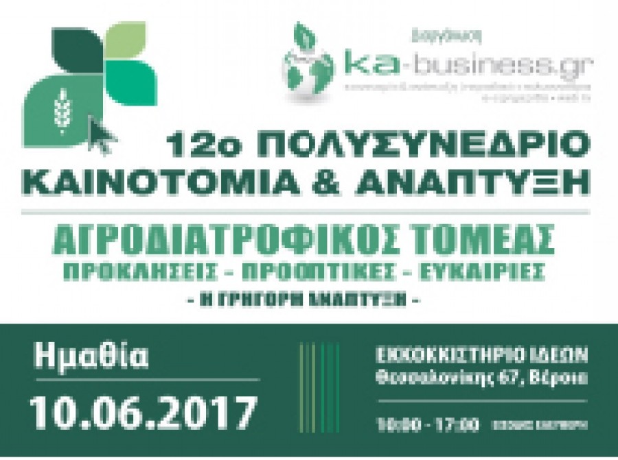 Το 12ο Πολυσυνέδριο ΚΑΙΝΟΤΟΜΙΑ & ΑΝΑΠΤΥΞΗ έχει τίτλο «ΓΡΗΓΟΡΗ ΑΝΑΠΤΥΞΗ ΑΓΡΟΔΙΑΤΡΟΦΙΚΟΥ ΤΟΜΕΑ- Ο ΑΓΡΟΤΙΚΟΣ ΤΟΜΕΑΣ ΣΕ ΠΡΩΤΟ ΠΛΑΝΟ: ΠΡΟΚΛΗΣΕΙΣ – ΕΥΚΑΙΡΙΕΣ – ΠΡΟΟΠΤΙΚΕΣ».