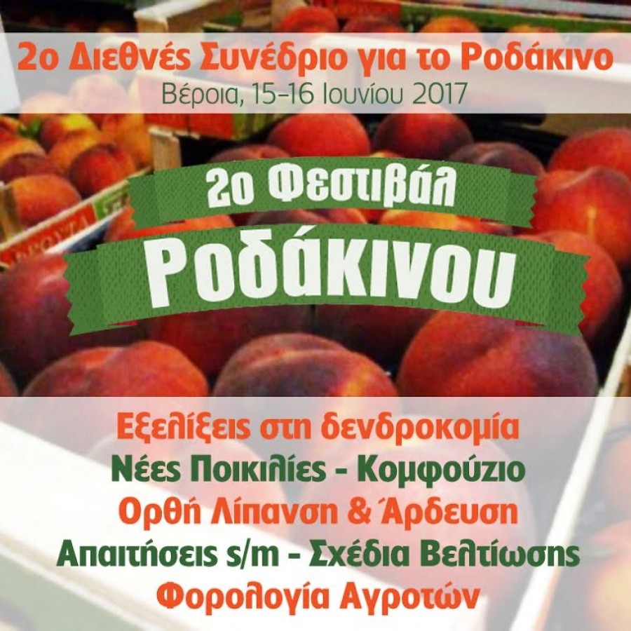 Ξεκινά την Πέμπτη στη Βέροια (5.30μμ ξενοδοχείο Αιγές Μέλαθρον) το 2ο Διεθνές Συνέδριο στα πλαίσια του Φεστιβάλ Ροδάκινου. Καταξιωμένοι ομιλητές από την Ελλάδα και το εξωτερικό θα καλύψουν όλα τα θέματα που αφορούν την αγροτική παραγωγή. Σχήματα φυτεύσεων, νέες ποικιλίες, άρδευση, λίπανση, φυτοπροστασία, εμπορία, διακίνηση και φορολογία αγροτών και χρηματοδοτικά προγράμματα, είναι μόνο μερικά από τα θέματα για τα οποία θα έχουν την ευκαιρία να ενημερωθούν οι αγρότες. Η συμμετοχή είναι δωρεάν. Δείτε αναλυτικά το πρόγραμμα: