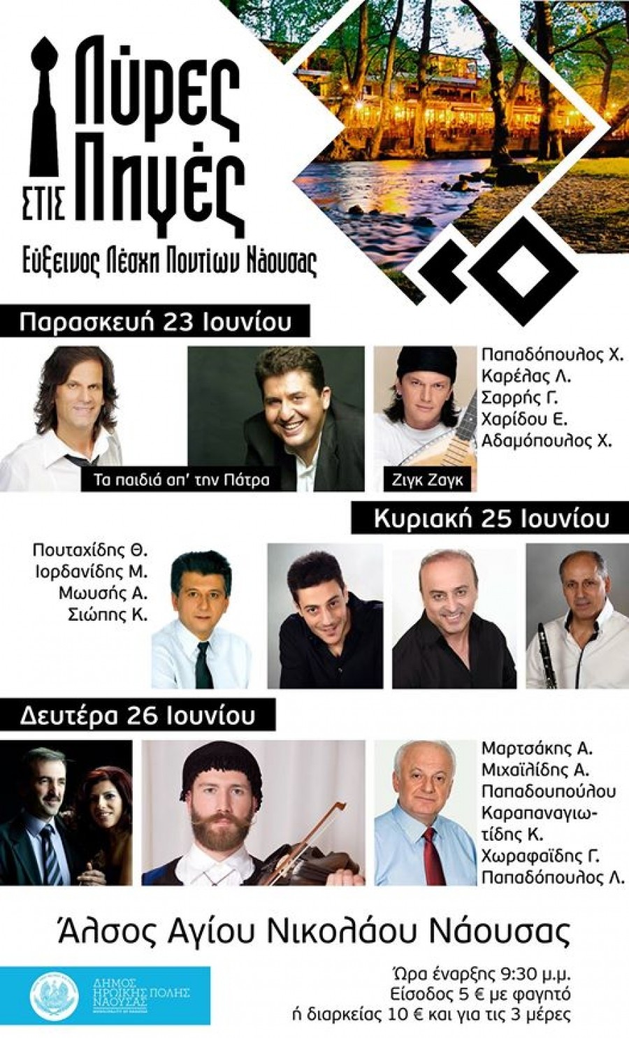 Βραδιές Ελλάδας επιφυλάσσει η Εύξεινος Λέσχη Ποντίων Νάουσας που διοργανώνει για 2η συνεχόμενη χρονιά τις εκδηλώσεις με τίτλο «Λύρες στις Πηγές», στο πλαίσιο των 90 χρόνων του συλλόγου. Οι εκδηλώσεις θα πραγματοποιηθούν στο Άλσος του Αγίου Νικολάου στις 23, 24, 25 και 26 Ιουνίου. Σύμφωνα με τον πρόεδρο Φώτη Φανιάδη στη συνέντευξη τύπου της Τετάρτης: “Στόχος μας είναι η ανάδειξη της φυσικής ομορφιάς του Άλσους, μέσω της πολιτιστικής χρήσης του, ενώ τα έσοδα θα διατεθούν στο βαρύ έργο διάσωσης της Εθνικής Βιβλιοθήκης Αργυρουπόλεως”.