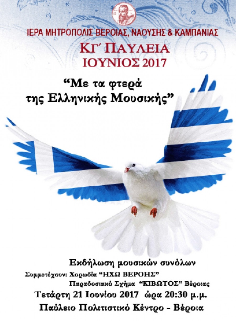 Από την Ιερά Μητρόπολη Βεροίας, Ναούσης & Καμπανίας ανακοινώνεται ότι στα πλαίσια των ΚΓ’ ΠΑΥΛΕΙΩΝ θα πραγματοποιηθεί εκδήλωση με τίτλο «Με τα Φτερά της Ελληνικής Μουσικής», αφιερωμένη στην Παγκόσμια Μέρα Μουσικής, την Τετάρτη 21 Ιουνίου 2017, και ώρα 8:30 μ.μ. στο Παύλειο Πολιτιστικό Κέντρο Βέροιας.
