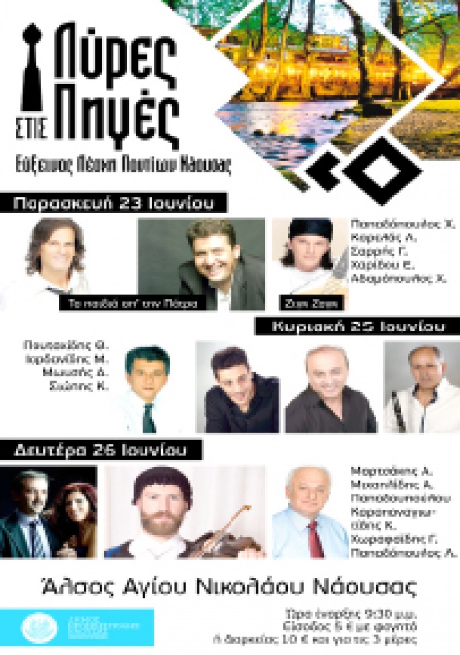 Βραδιές Ελλάδας επιφυλάσσει η Εύξεινος Λέσχη Ποντίων Νάουσας που διοργανώνει για 2η συνεχόμενη χρονιά τις εκδηλώσεις με τίτλο «Λύρες στις Πηγές», στο πλαίσιο των 90 χρόνων του συλλόγου. Οι εκδηλώσεις θα πραγματοποιηθούν στο Άλσος του Αγίου Νικολάου στις 23, 24, 25 και 26 Ιουνίου.