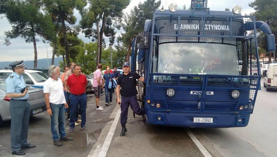 (Στη φωτογραφία το αστυνομικό όχημα παρκάρει στην Εληά, στο σημείο όπου περίμεναν τον υπουργό μέλη των Συλλόγων Αγροτών Βέροιας και Αλεξάνδρειας).