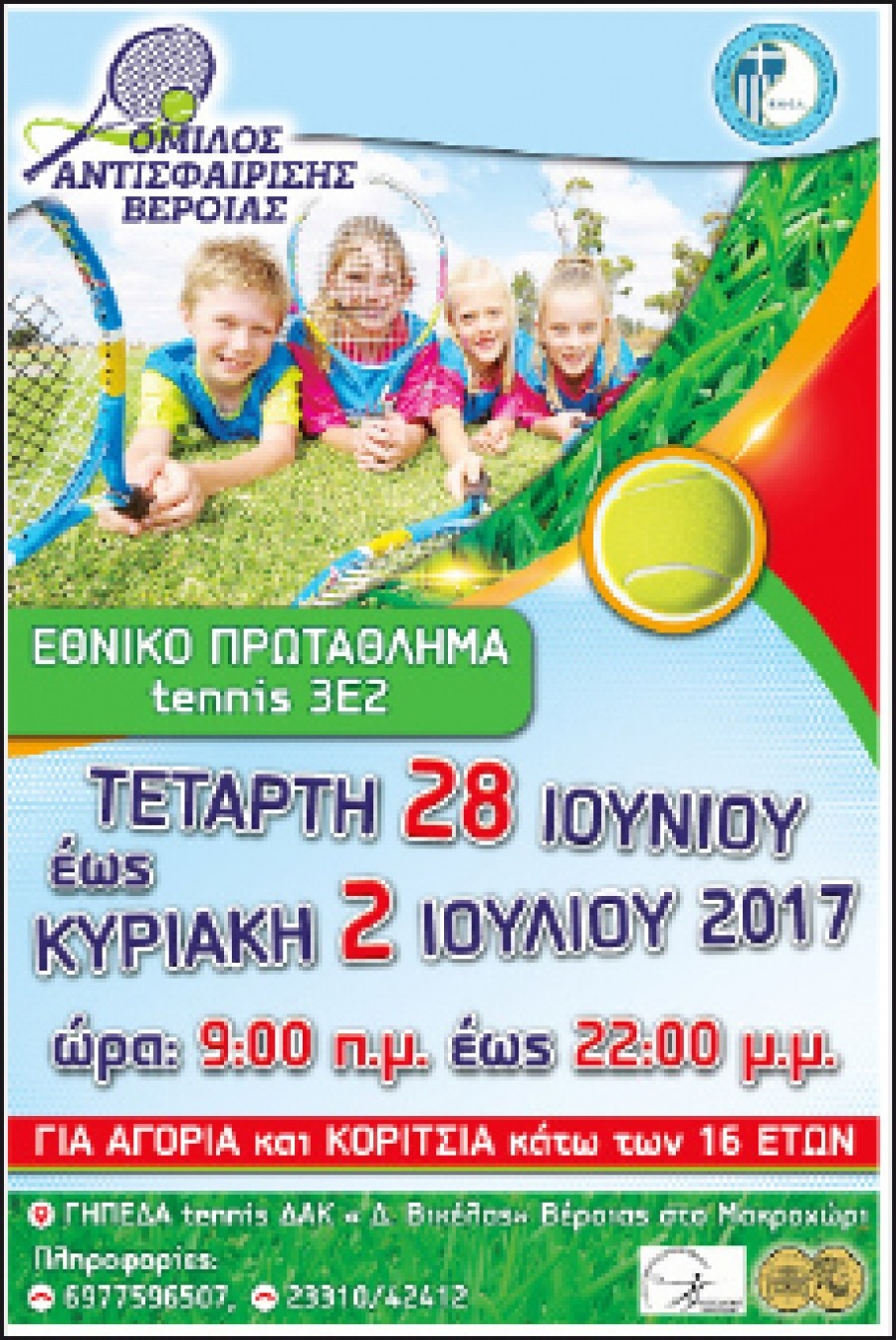 Την Τετάρτη 28 Ιουνίου ξεκίνησε το Εθνικό Πρωτάθλημα τένις επιπέδου Ε2 στη Βέροια. Διοργανωτής των αγώνων ο Όμιλος Αντισφαίρισης Βέροιας με εντολή της Ελληνικής Φίλαθλης Ομοσπονδίας Αντισφαίρισης και της Γ΄Ένωσης σωματείων αντισφαίρισης Κ.Δ. Μακεδονίας. Το πρωτάθλημα θα διαρκέσει μέχρι την Κυριακή 2 Ιουλίου.