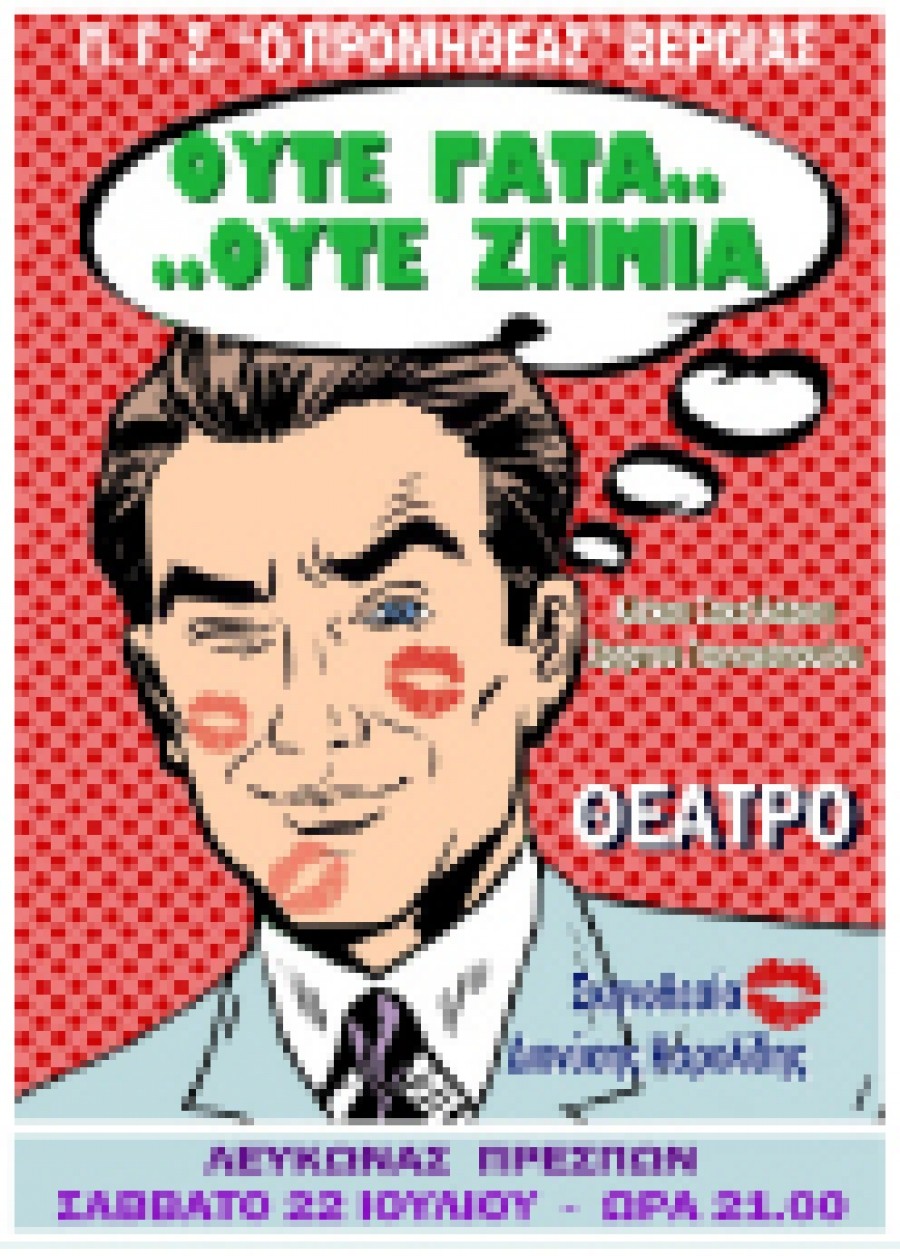Πρεμιέρα στο Λευκώνα Πρεσπών με το έργο των Α. Σακελλάριου-Χ. Γιαννακόπουλου, «ΟΥΤΕ ΓΑΤΑ ΟΥΤΕ ΖΗΜΙΑ» κάνει ο Σύλλογος του Προμηθέα, το Σάββατο 22 Ιουλίου 2017 στις 9,00 το βράδυ. Στην παράσταση παίζουν οι ερασιτέχνες ηθοποιοί : Νίκος Μπουζίνης, Ευμορφία Μπαλτζή, Όλγα Απαζίδου, Γιώργος Γεωργίου, Σοφία Γκότση, Ελένη Καραϊωσήφ, Αντώνης Καρολίδης, Δώρα Ευστρατιάδου, Διονύσης Καρολίδης, Κάτια Κουπίδου και ο Στέφανος Γαϊτάνος.