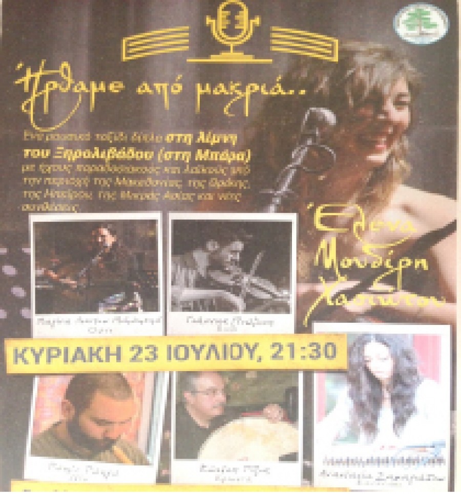 Η Έλενα Μουδίρη- Χασιώτου και η ορχήστρα της θα μας ταξιδέψουν με ήχους παραδοσιακούς, λαϊκούς και με νέες συνθέσεις από τις περιοχές της Μακεδονίας, της Θράκης, της Ηπείρου και της Μικράς Ασίας.