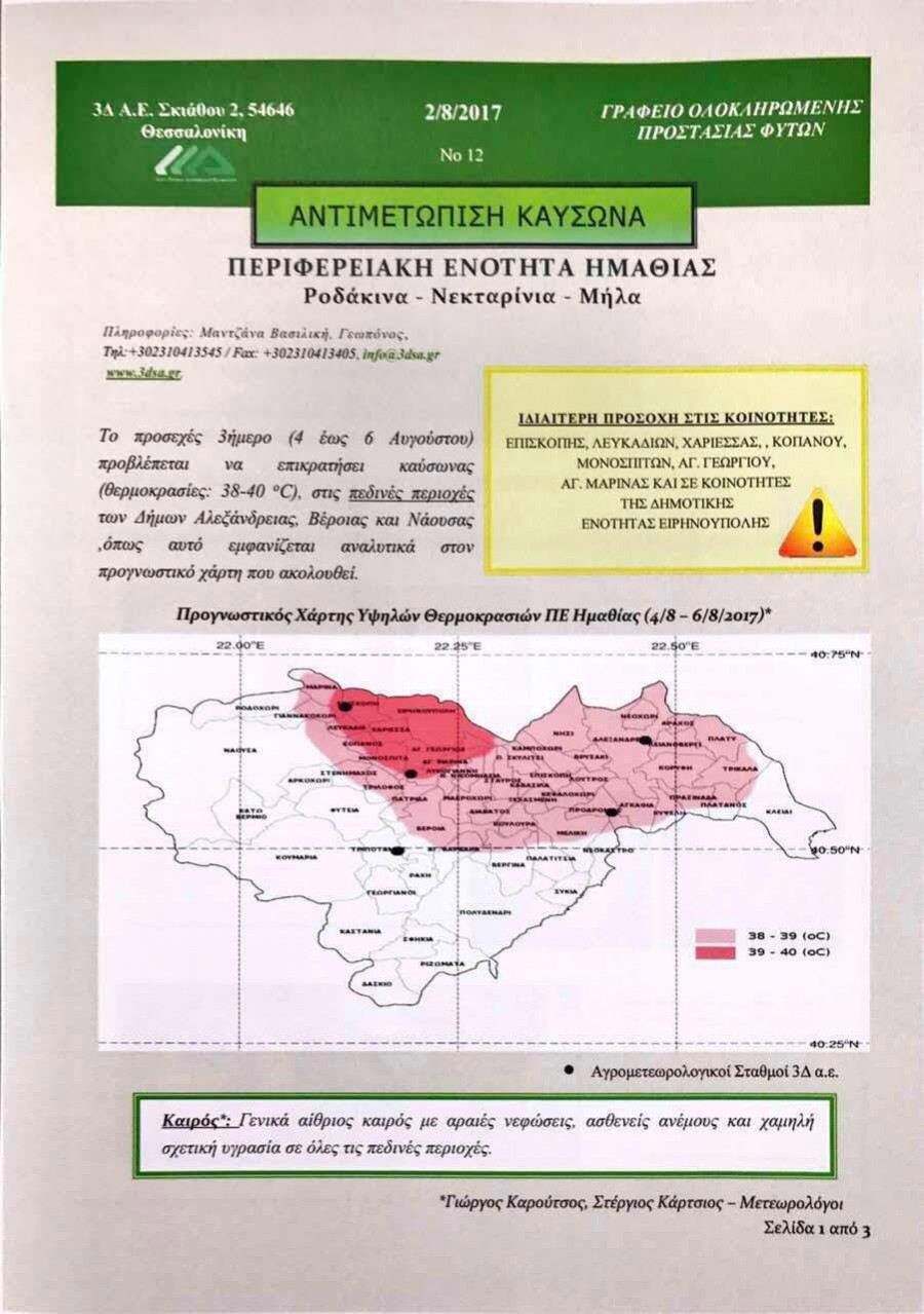 Στις αναγκαίες ενέργειες προστασίας της παραγωγής (ροδάκινα, νεκταρίνια, μήλα) από τον αναμενόμενο καύσωνα που προβλέπεται για το τριήμερο 4-6 Αυγούστου προτρέπει ενημέρωση του Γραφείου Ολοκληρωμένης Προστασίας Φυτών. Οι θερμοκρασίες που αναμένονται θα κυμανθούν μέχρι και τους 38-40 βαθμούς στις πεδινές περιοχές της Ημαθίας, όπως φαίνεται στον σχετικό χάρτη. Ιδιαίτερη προσοχή πρέπει να δείξουν οι παραγωγοί στις κοινότητες: Επισκοπής, Λευκαδίων, Χαρίεσσας, Κοπανού, Μονοσπίτων, Αγίου Γεωργίου, Αγίας Μαρίνας και όλες τις κοινότητες του πρώην δήμου Ειρηνούπολης.