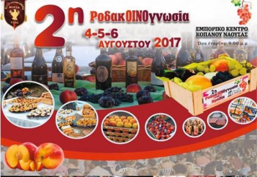 Υπό την αιγίδα του υπουργείου Αγροτικής Ανάπτυξης, τη χορηγία του υπουργείου Εσωτερικών (Μακεδονίας-Θράκης), του δήμου Νάουσας και τη συνδιοργάνωση του Επιμελητηρίου Ημαθίας ξεκινούν από τον Μ.Ε.Γ.Σ.Ν. Κοπανού ‘Η Μίεζα’ σήμερα στο Εμπορικό Κέντρο Κοπανού οι εκδηλώσεις της 2ης ΡοδακΟΙΝΟγνωσίας, που θα διαρκέσουν μέχρι και την Κυριακή.