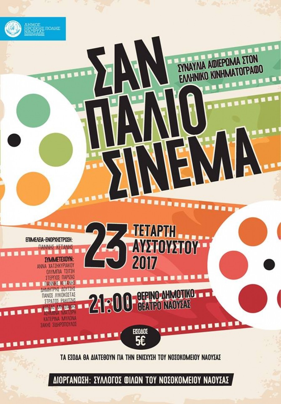 Συναυλία με τίτλο “Σαν παλιό σινεμά”, αφιερωμένη στον ελληνικό κινηματογράφο, θα πραγματοποιηθεί στις 23 Αυγούστου στο θερινό δημοτικό θέατρο Νάουσας. Επιμέλεια και ενορχήστρωση: Γιάννης Κετάνης. Και με τη συμμετοχή πολλών τοπικών καλλιτεχνών. Τα έσοδα της εκδήλωσης θα δοθούν στον σύλλογο φίλων του Νοσοκομείου Νάουσας.