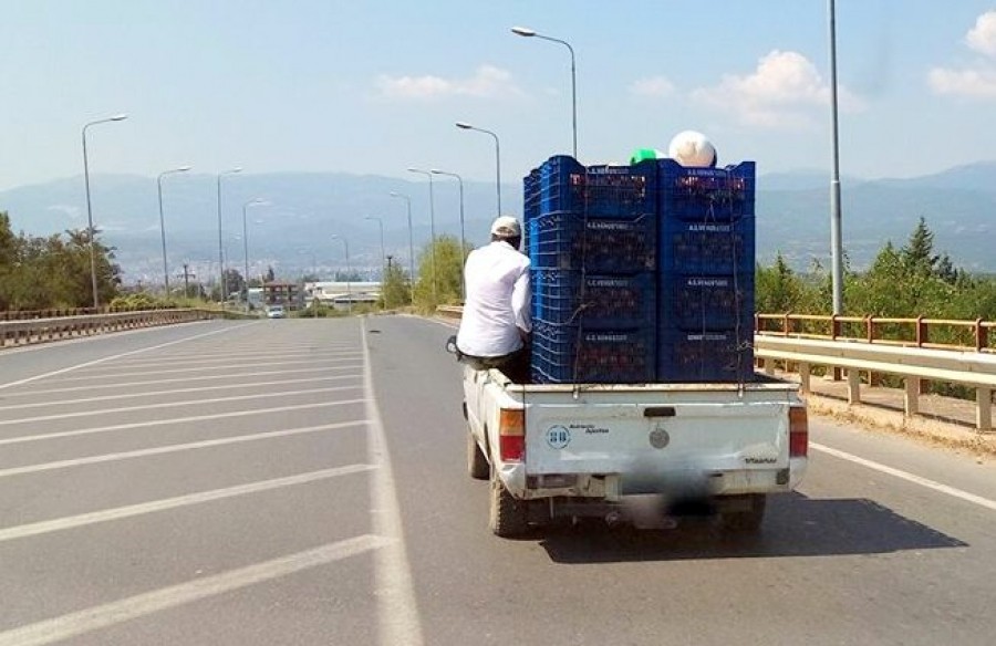 Εικόνα καθημερινής τρέλας στους δρόμους της Ημαθίας τα καλοκαίρια της παραγωγικής περιόδου, με την ασφάλεια οδήγησης να… πάει περίπατο μαζί με τις παραγωγές μας! Στη φωτογραφία ένα πρόσφατο παράδειγμα, από τα πολλά που βλέπουν τα μάτια μας σε καρότσες και πλατφόρμες.