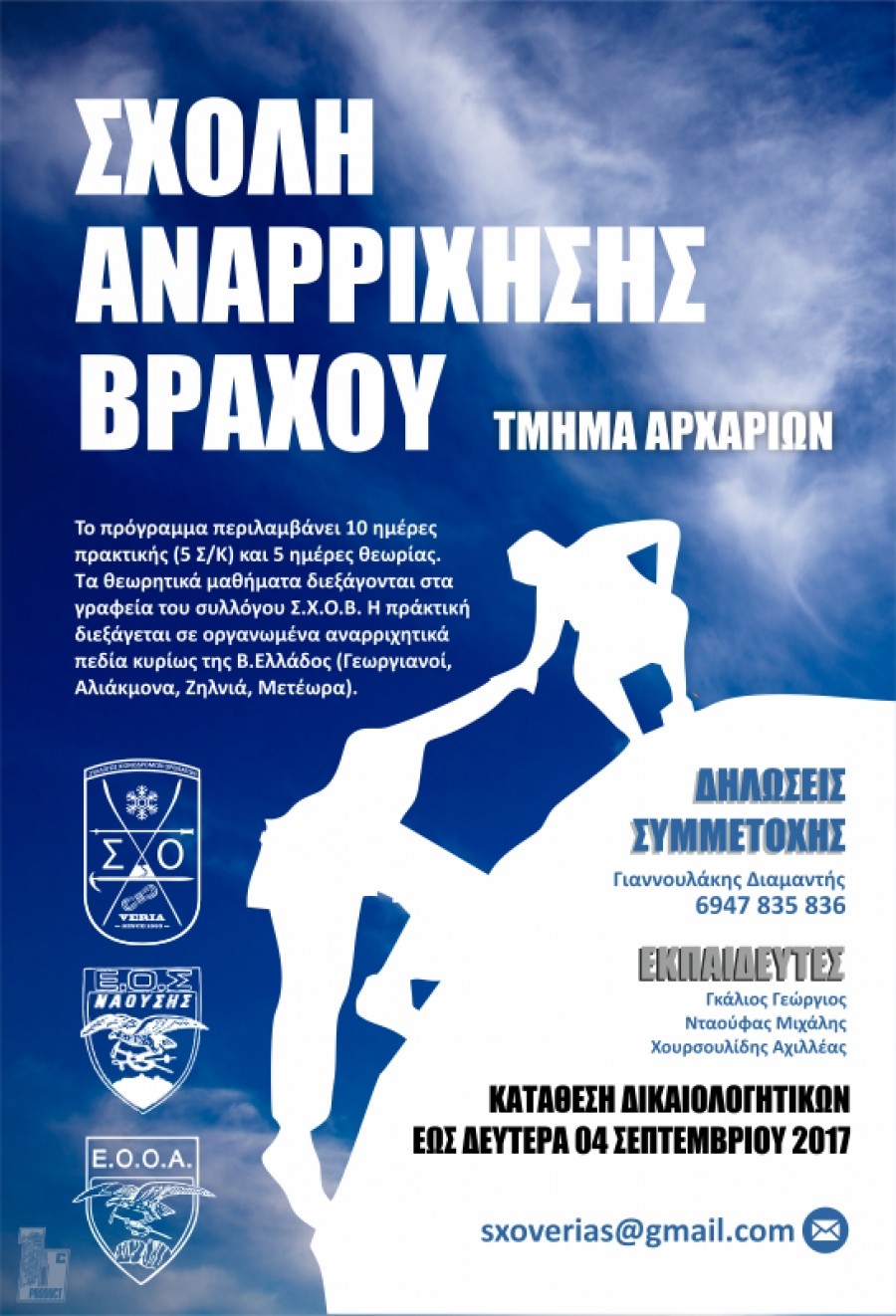 Οι Σ.Χ.Ο. Βέροιας και Ε.Ο.Σ. Νάουσας συνδιοργανώνουν σχολή αρχαρίων αναρρίχησης βράχου υπό την αιγίδα της Ελληνικής Ομοσπονδίας Ορειβασίας & Αναρρίχησης. Το πρόγραμμα απευθύνεται σε ενήλικους κάθε ηλικίας, με στοιχειώδη φυσική κατάσταση, ΧΩΡΙΣ απαραίτητη προηγούμενη εμπειρία, που αγαπάνε το βουνό και το σκαρφάλωμα. Παρέχει πολύτιμη γνώση και για τους ορειβάτες – πεζοπόρους,καθώς είναι σημαντικό να γνωρίζουμε πατήματα & πιασίματα σε βράχο, όπως επίσης και η ασφάλιση, η χρήση σχοινιών, σχοινο-συντροφιάς κ.α.
