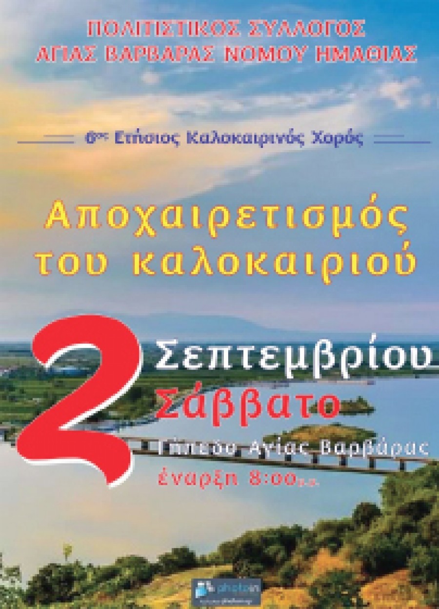 Ο Πολιτιστικός Σύλλογος Αγίας Βαρβάρας διοργανώνει τον 6ο ετήσιο καλοκαιρινό χορό, « Αποχαιρετισμός του καλοκαιριού» , (το πρώτο Σάββατο του Σεπτέμβρη) στις 2 Σεπτεμβρίου 2017 και ώρα 8:00μ.μ. στο γήπεδο της Αγίας Βαρβάρας, Νομού Ημαθίας.