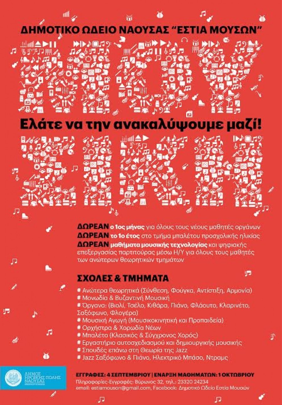 Περισσότερες πληροφορίες: τηλ. 2332024234 (Γραμματεία Δημοτικού Ωδείου Νάουσας).