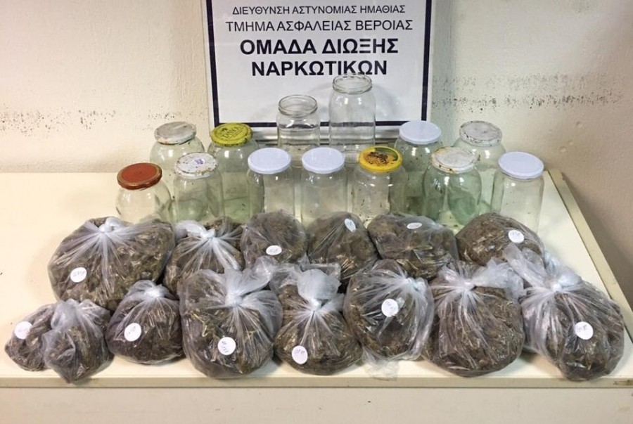 Συνελήφθη το απόγευμα, σε περιοχή της Βέροιας 34χρονος για διακίνηση και κατοχή κάνναβης. Μετά από συντονισμένη επιχείρηση των αστυνομικών του Τμήματος Ασφάλειας Βέροιας ο 34χρονος εντοπίστηκε σε αγρόκτημα ιδιοκτησίας του και σε έρευνα που πραγματοποιήθηκε εντοπίστηκαν θαμμένα στο έδαφος 13 γυάλινα βάζα με συνολική ποσότητα κάνναβης βάρους 1 κιλού και 920 γραμμαρίων, τα οποία και κατασχέθηκαν.