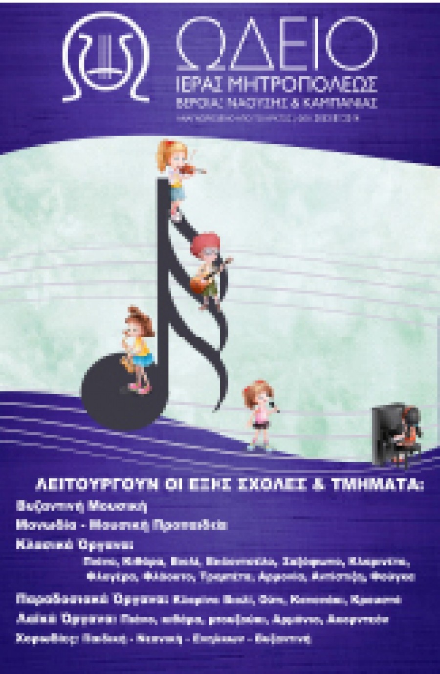 Από το Ωδείο της Ιεράς Μητροπόλεως Βεροίας, Ναούσης & Καμπανίας ανακοινώνεται ότι από την Δευτέρα 4 Σεπτεμβρίου 2017 άρχισαν οι εγγραφές σε όλα τα τμήματα του Ωδείου.