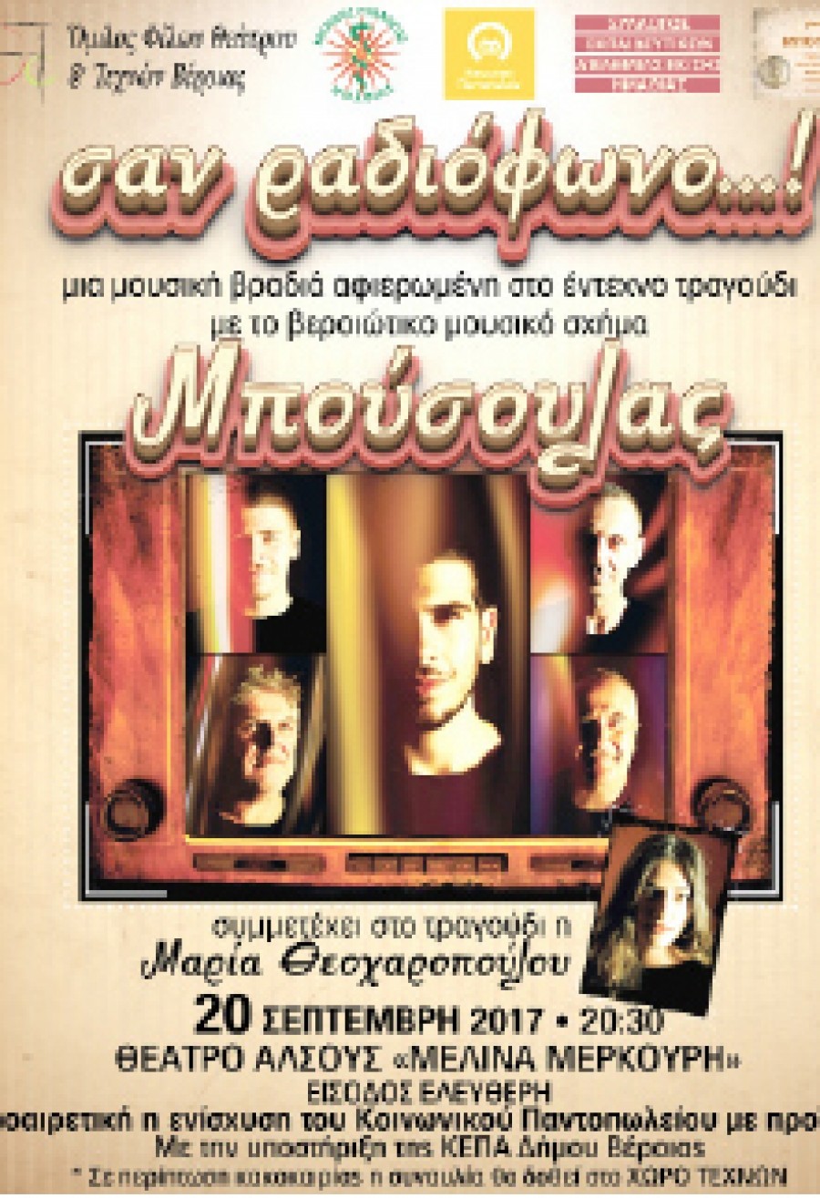 «Στις 20 Σεπτεμβρίου, στο Θέατρο Άλσους «ΜΕΛΙΝΑ ΜΕΡΚΟΥΡΗ» θα πραγματοποιηθεί συναυλία σύγχρονου έντεχνου τραγουδιού με το Βεροιώτικο Μουσικό σχήμα «ΜΠΟΥΣΟΥΛΑΣ».